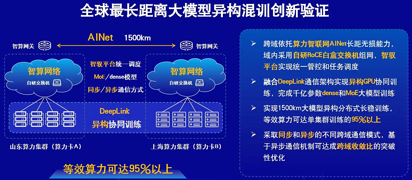 IT之家从大会获悉,通过自动调整多种并行策略和跨域收敛比下 MoE 模型和 Dense 模型的参数配置,联合团队完成了超 1500 公里跨域的千亿参数 AI 大模型异构混训试验,经验证等效算力可达单芯片单集群等效算力的 95% 以上。